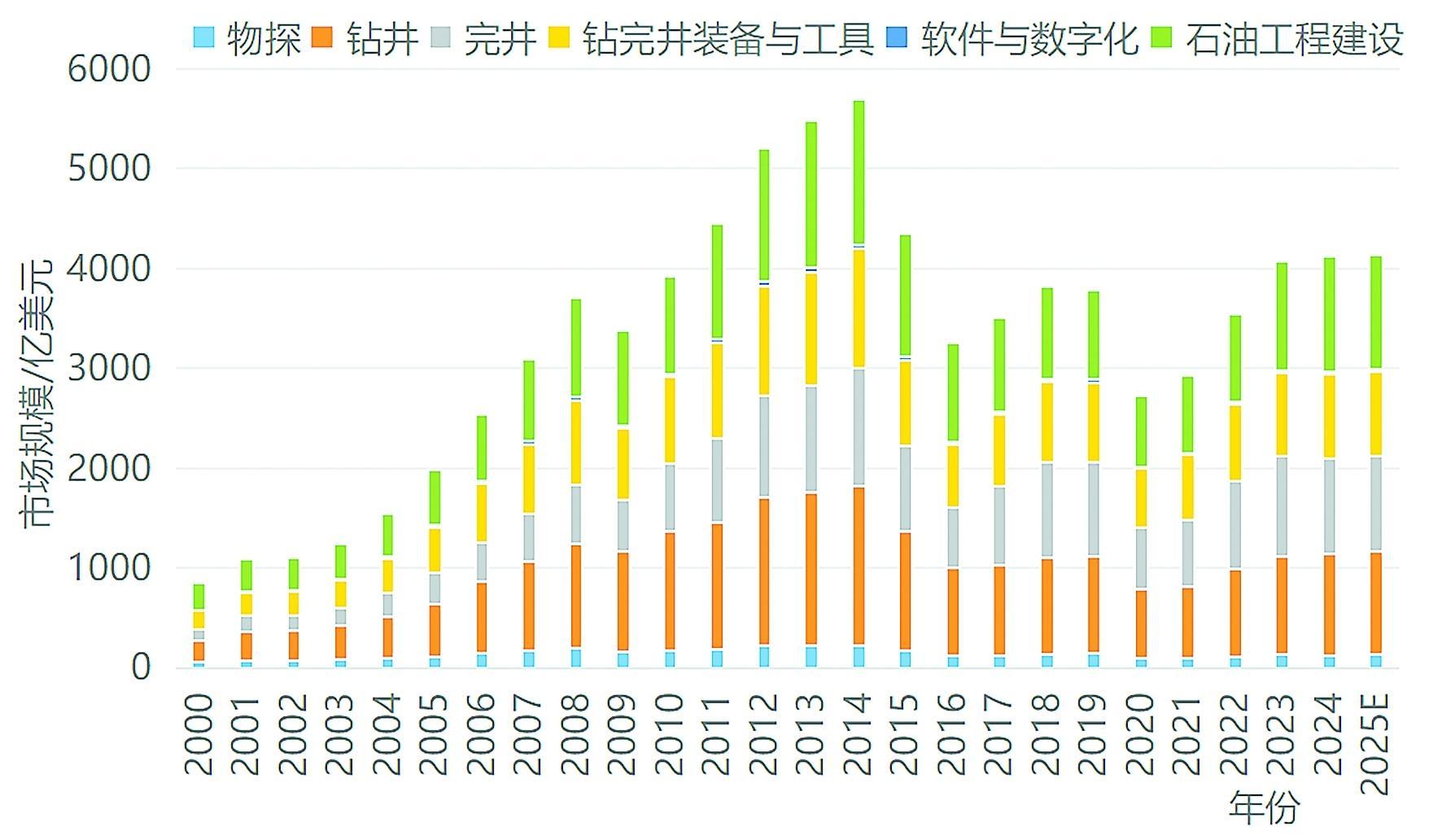 2024年,全球能源轉(zhuǎn)型持續(xù)推進(jìn),能源結(jié)構(gòu)深刻調(diào)整,全球油氣供應(yīng)充裕,需求保持增長(zhǎng),國(guó)際油氣價(jià)格持續(xù)回落,振幅收窄。全球油氣勘探開(kāi)發(fā)投資小幅增長(zhǎng),低碳領(lǐng)域投資已超越油氣。2024年,全球油氣工程市場(chǎng)保持穩(wěn)定,比上年增加1.4%,至4127億美元,其中石油工程建設(shè)、鉆井、鉆完井裝備與工具市場(chǎng)分別增長(zhǎng)6.8%、2.2%、2.1%,完井、物探市場(chǎng)分別下降4.7%、4%;陸上市場(chǎng)下降2%,至2758億美元,海上市場(chǎng)增長(zhǎng)9.1%,至1369億美元。